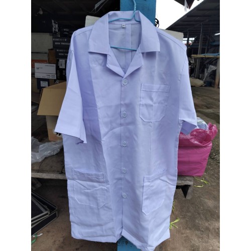 เสื้อกาวน์สำหรับใช้ในห้องทดลองสีขาว ลักษณะเป็นเสื้อคอปกทำมาจากผ้าฝ้ายอย่างดี กระเป๋า