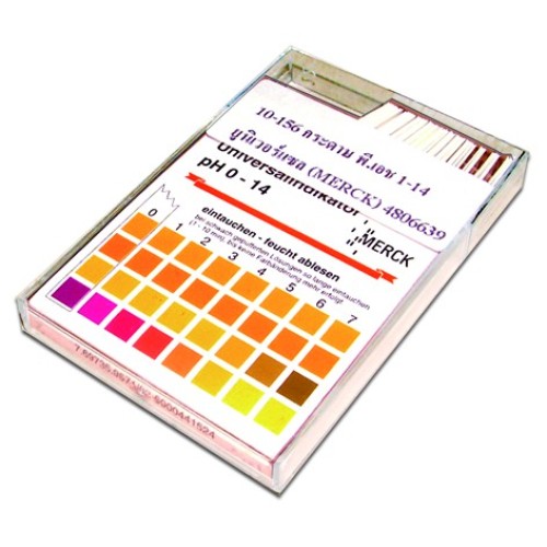 กระดาษวัดค่า pH . ในช่วง pH 1-14 มีแถบสีเปรียบเทียบค่า pH สามารถเห็นผลได้ชัดเจน บรรจุในกล่องพลาสติก ป้องกันความชื้น